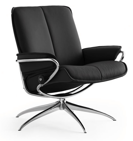 Stressless City a sleek, elegant recliner with perfect comfort. Stressless City gives you the best of Norwegian design, along with the sitting comfort that is only found in a Stressless. With chrome details and high grade leather on a rotating base this recliner is set to make an impression. Stressless City comes in two different heights and back lengths, to make it your perfect companion. The low back model invites you to gather friends and family around the living room table.